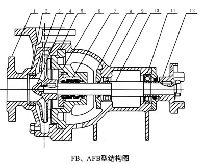 AFB型不銹鋼耐腐蝕離心泵是在FB型耐腐蝕泵的基礎(chǔ)上改進(jìn)設(shè)計(jì)的,均采用新型的付葉輪動(dòng)力軸封裝置,采用先進(jìn)水力模型,新穎結(jié)構(gòu)與高強(qiáng)度組合式雙端面機(jī) 械密封,具有高次節(jié)能、結(jié)構(gòu)緊湊、性能穩(wěn)定、使用可靠等優(yōu)點(diǎn)。屬單級單吸懸臂式耐腐蝕離心泵。該泵與輸送介質(zhì)接觸的過流部份零件,均采用 1Cr18Ni9Ti材料制造。用于輸送不含固體顆粒,有腐蝕性液體,被輸送介質(zhì)溫度為-20℃~120℃,泵進(jìn)口壓力不大于2kg/cm2。采用雙端面 密封冷卻裝置可輸送300℃左右的高溫介質(zhì)。