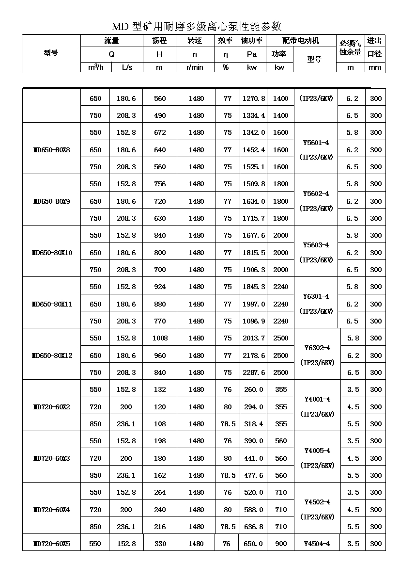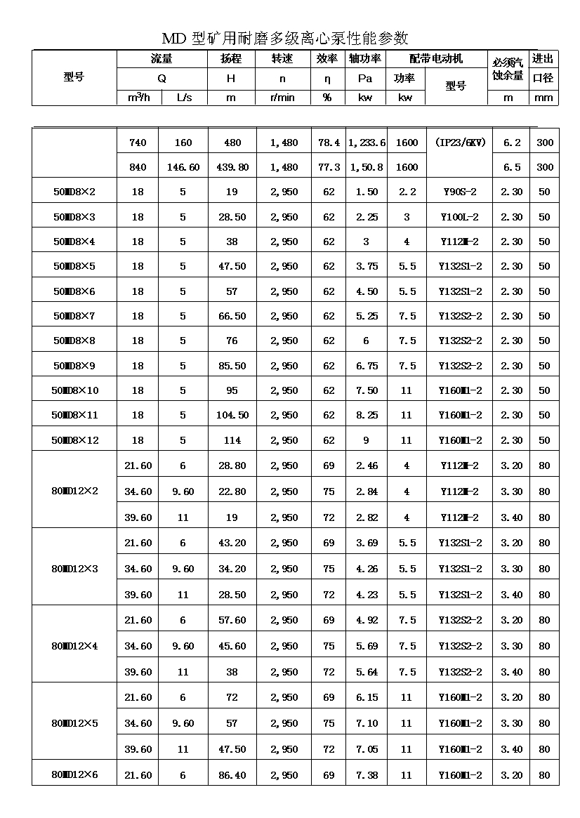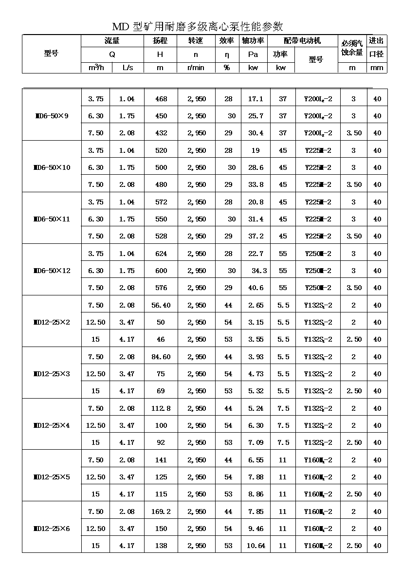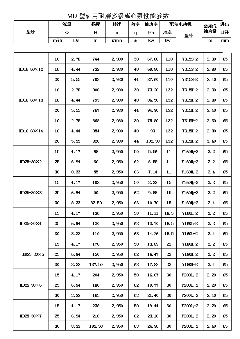 MD型耐磨多級離心泵,是我公司在D型單吸多級清水離心泵的基礎上,改造設計的一種耐磨多級離心泵。MD型耐磨多級離心泵,高效節能,耐磨可靠,壽命長, 特別適用于礦山排水,抽送固體顆粒含量不大于1.5%(顆粒直徑小于0.5毫米)的礦井水及其他類似液體,液體溫度不高于80度。