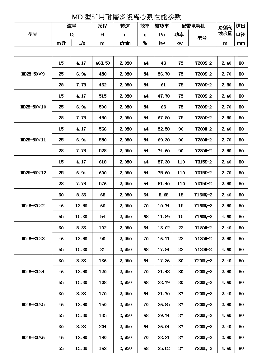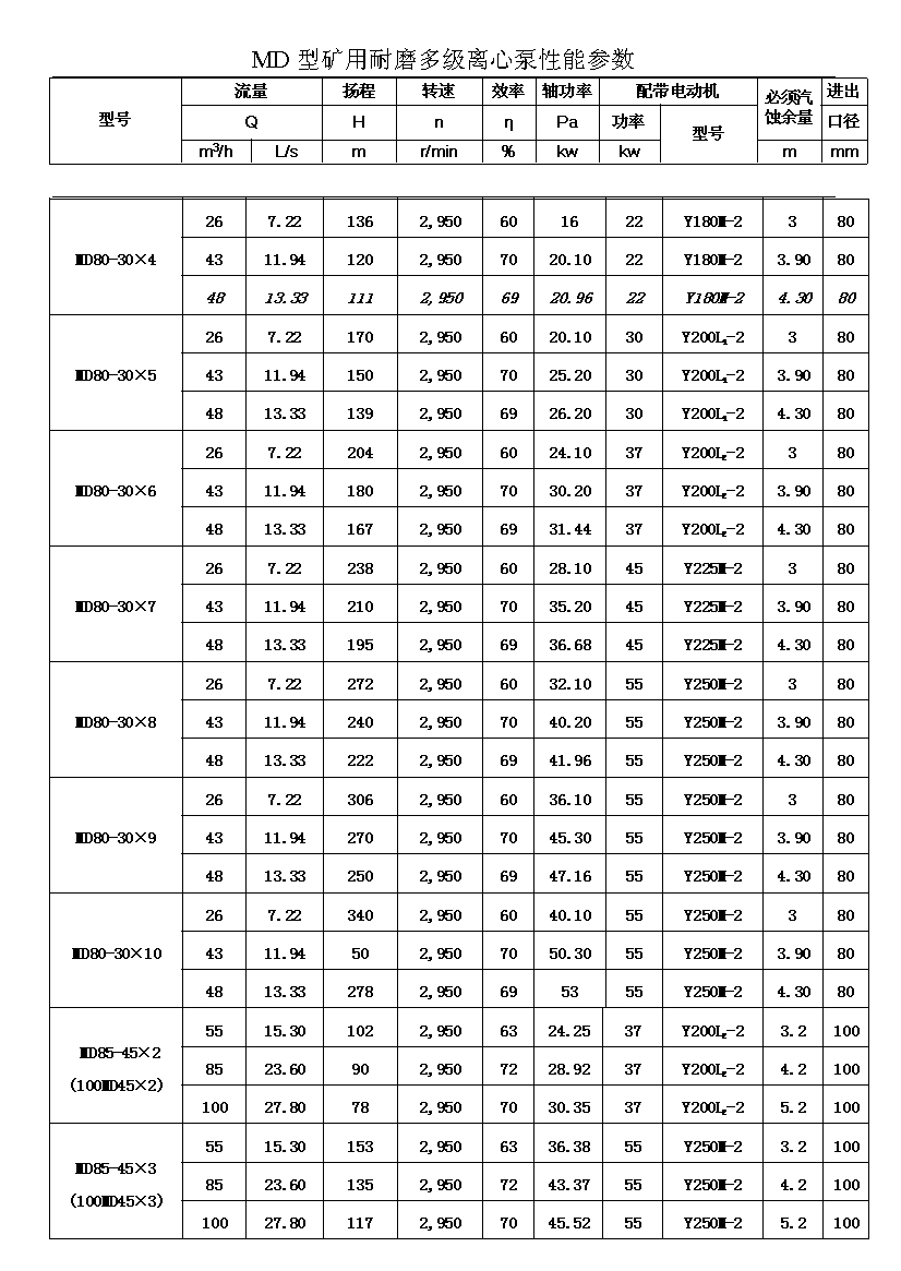 注:D(DF多級耐腐蝕離心泵、DY多級離心油泵、MD多級耐磨離心泵)80-30為習慣表示方法,其中80表示泵吸入口直徑為80mm,30表示泵設計點單級揚程為30m,其它含義與上述表示方法相同。