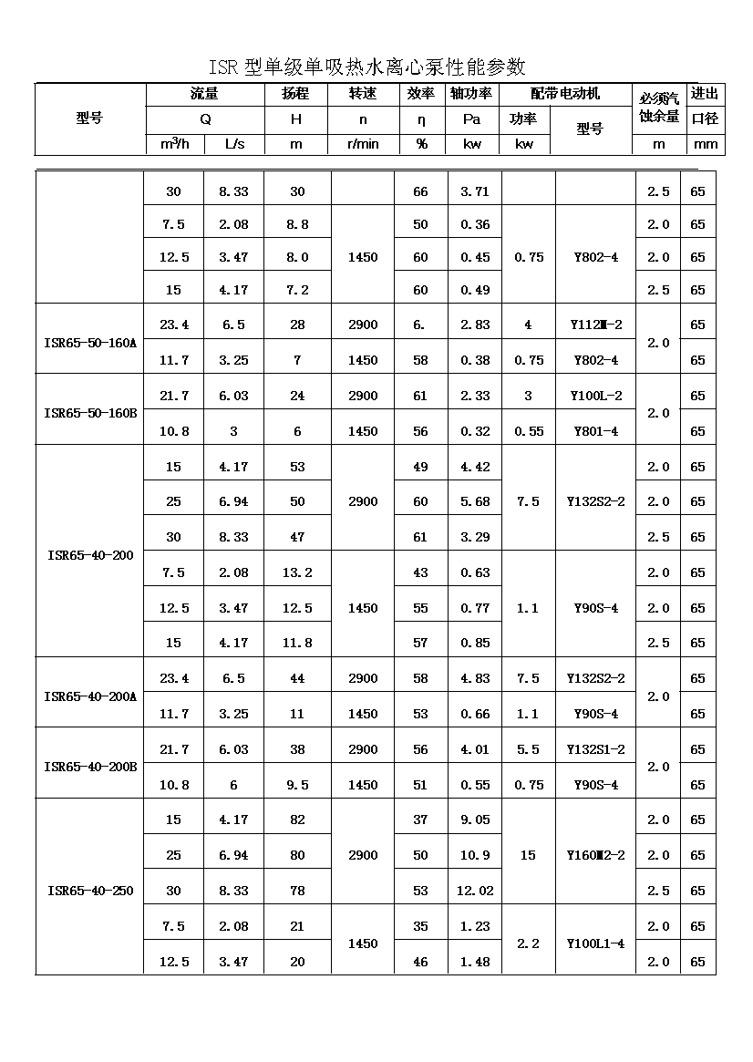 ISR系列單級單吸熱水離心泵共有二十九種基本型,為滿足用戶對泵的不同性能要求,我廠采用了切割葉輪外徑的方法,從而增多了ISR泵的規(guī)格。